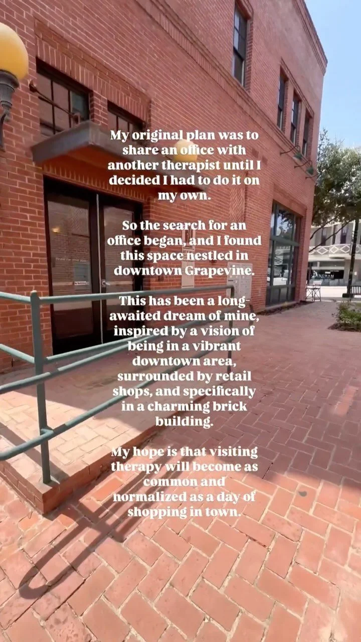 If you are wanting in-person therapy, I am open by appointment only. My office is located at 603 South Main St. Grapevine, Texas 76051.